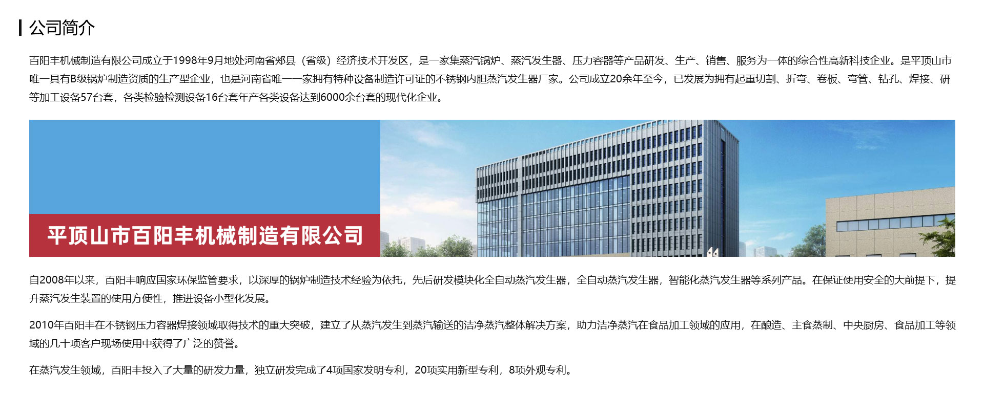 百陽豐機械制造有限公司成立于1998年9月地處河南省郟縣(省級)經(jīng)濟技術開發(fā)區(qū),是一家集蒸汽鍋爐、蒸汽發(fā)生器、壓力容器等產(chǎn)品研發(fā)、生產(chǎn)、銷售、服務為一體的綜合性高新科技企業(yè)。是平頂山市一家具有B級鍋爐制造資質(zhì)的生產(chǎn)型企業(yè),也是一家擁有特種設備制造許可證的不銹鋼內(nèi)膽蒸汽發(fā)生器廠家。公司成立20余年至今,已發(fā)展為擁有起重切割、折彎、卷板、彎管、鉆孔、焊接、研等加工設備57臺套,各類檢驗檢測設備16臺套年產(chǎn)各類設備達到6000余臺套的現(xiàn)代化企業(yè)。